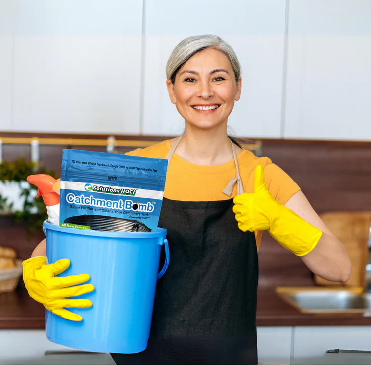 Dilute the HOCL Catchment Bomb to an appropriate concentration and apply it to areas such as roofs and gutters to remove organic matter and debris before they enter the catchment system.