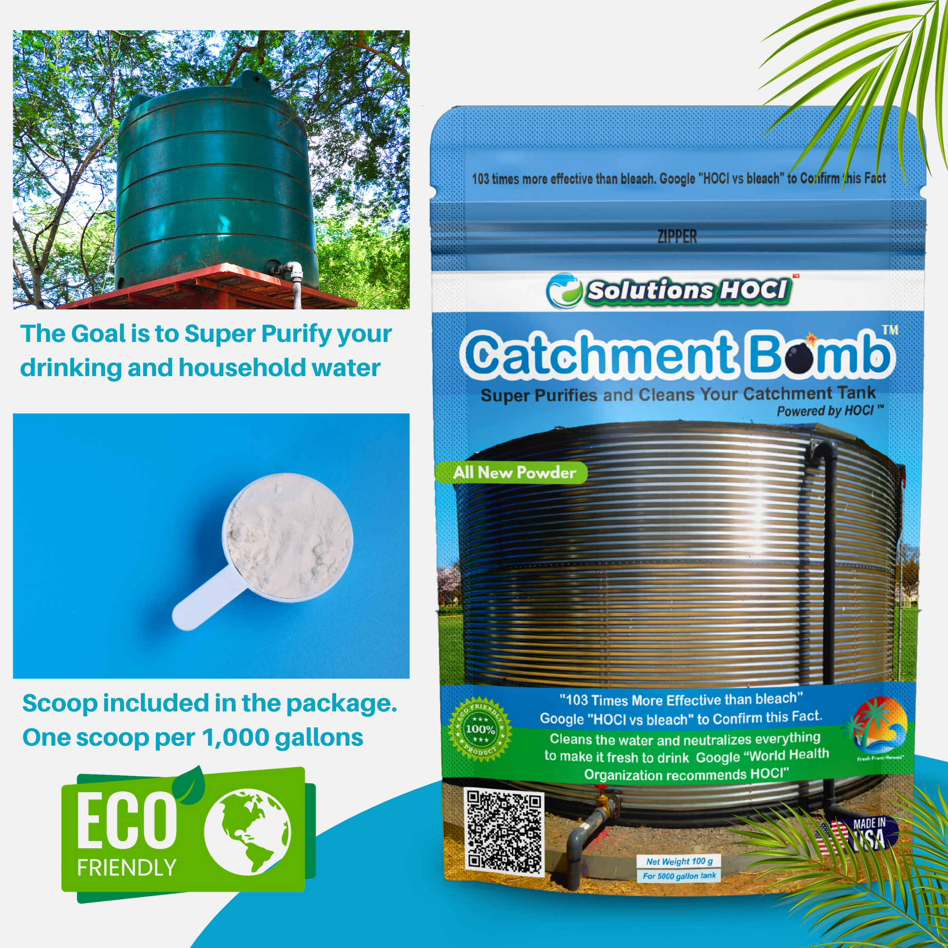 The SolutionsHOCL Catchment Bomb is an Extremely Efficient method to Super-purify the water in your Catchment tank. One hundred grams will Super-purify the water in your 5,000-gallon tank and Five hundred grams will Super-purify the water in your 25,000-gallon tank. Adjust the amount according to the size of the tank.