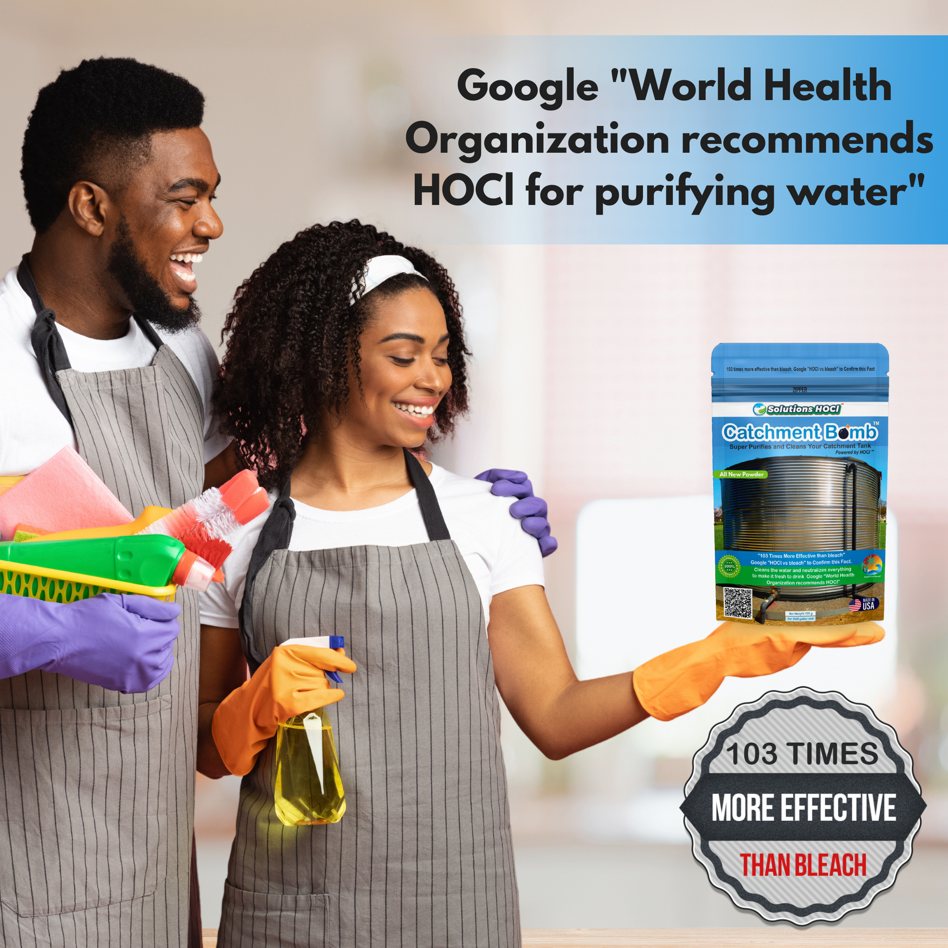 Drop in a scoop of SolutionsHOCL Catchment Bomb – Catchment Tank Cleaner, 1 scoop per 1,000 gallons, and let sit for 30 minutes. Then take a net and scoop out any floating organic matter, which will consist of the once-living, now-dead matter. This shows that all the unwanted matter in the Catchment tank is neutralized. The water is now Deep Cleaned, Sanitation at its Best: and ready to safely drink or bathe in. Google “World Health Organization recommends HOCl for cleaning up your water” to Confirm these Facts.