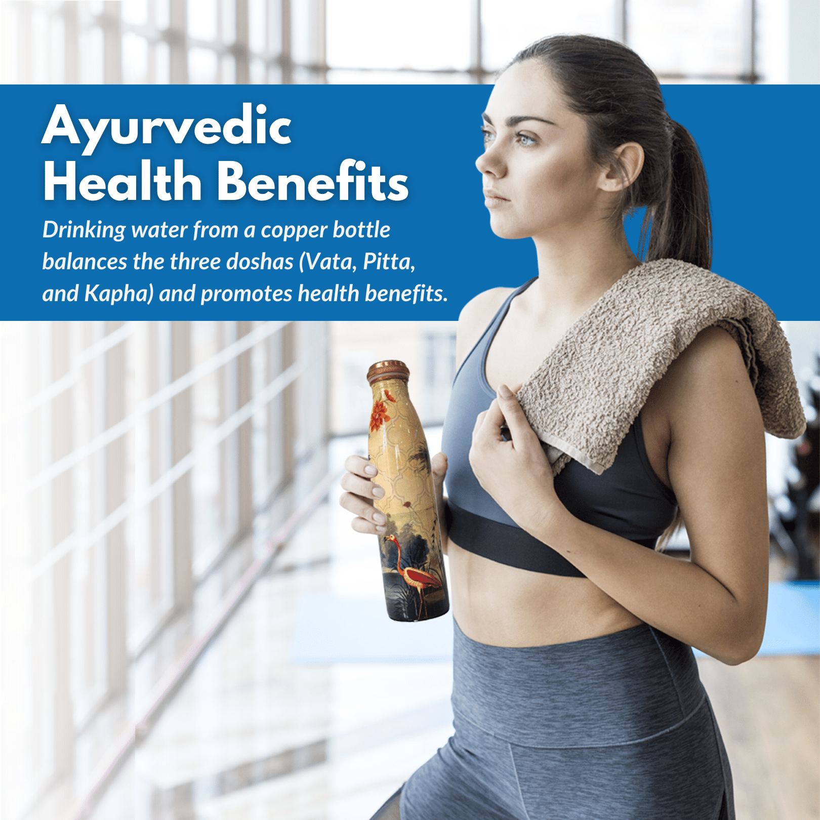 - Ayurvedic Health Benefits: Our copper water bottle follows Ayurveda's ancient principles, known for its holistic approach to health. Drinking water from a copper bottle balances the three doshas (Vata, Pitta, and Kapha) and promotes health benefits. It slows down the aging process, aids in weight loss, acts as a potent antioxidant that neutralizes free radicals and enhances brainpower.