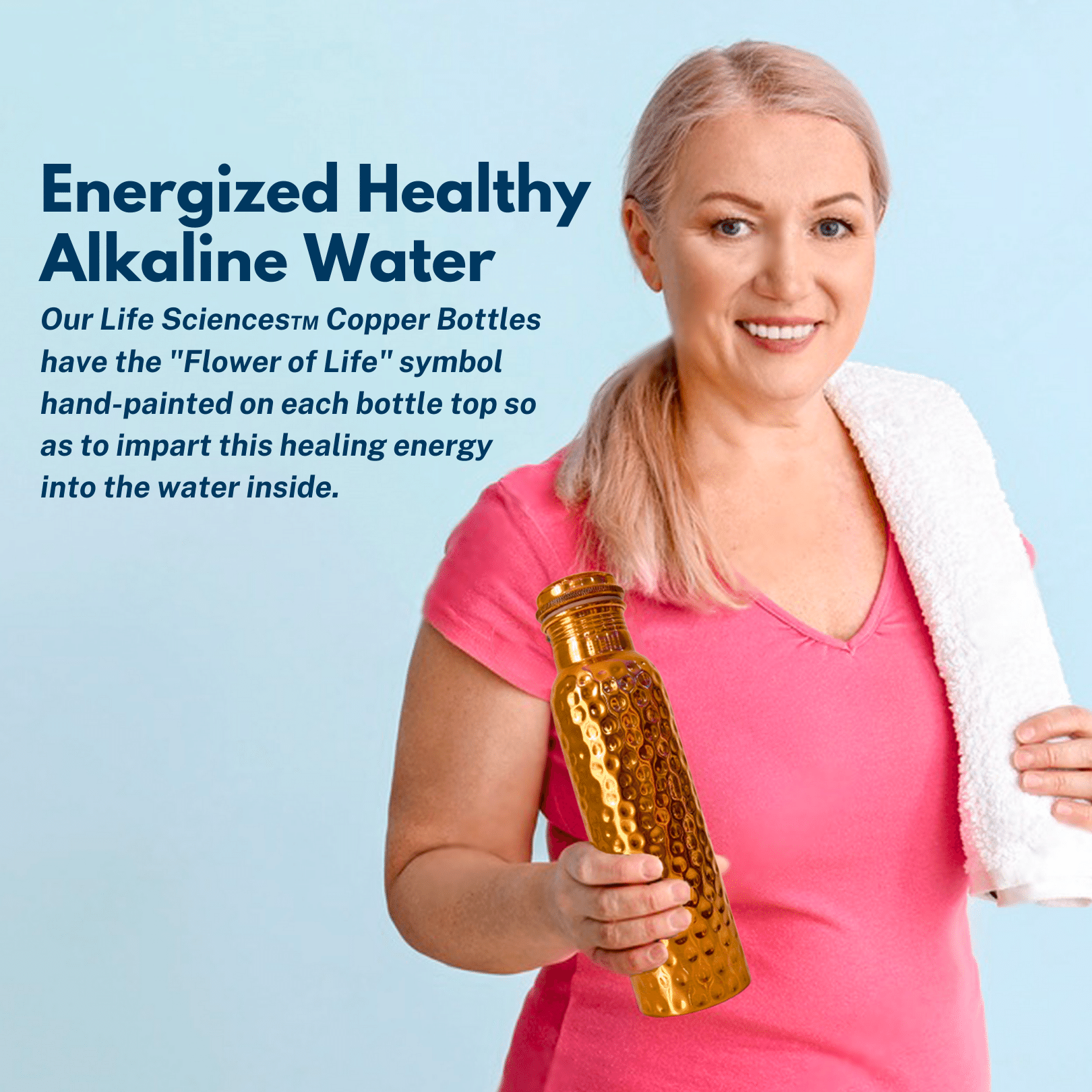 - Energized Health Water - Our Life Sciences™ Copper Bottles have the "Flower of Life" symbol hand-painted on each bottle top so as to impart this healing energy into the water inside. This sacred geometry pattern has been revered by many cultures for centuries. It represents the interconnectedness of all living things and the unity of the universe. This powerful symbol has been known to have a transformative effect on the energy of its surroundings, including water.