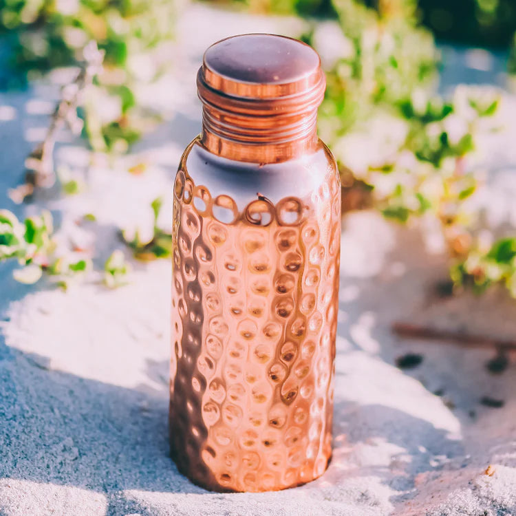 - Striking Artistry: Indulge in the captivating beauty of the Pounded Design on this copper bottle. The meticulously crafted hammered texture creates a visually stunning and unique pattern that catches the eye. Each hammered indentation tells a story of skilled craftsmanship, transforming a simple bottle into a work of art.