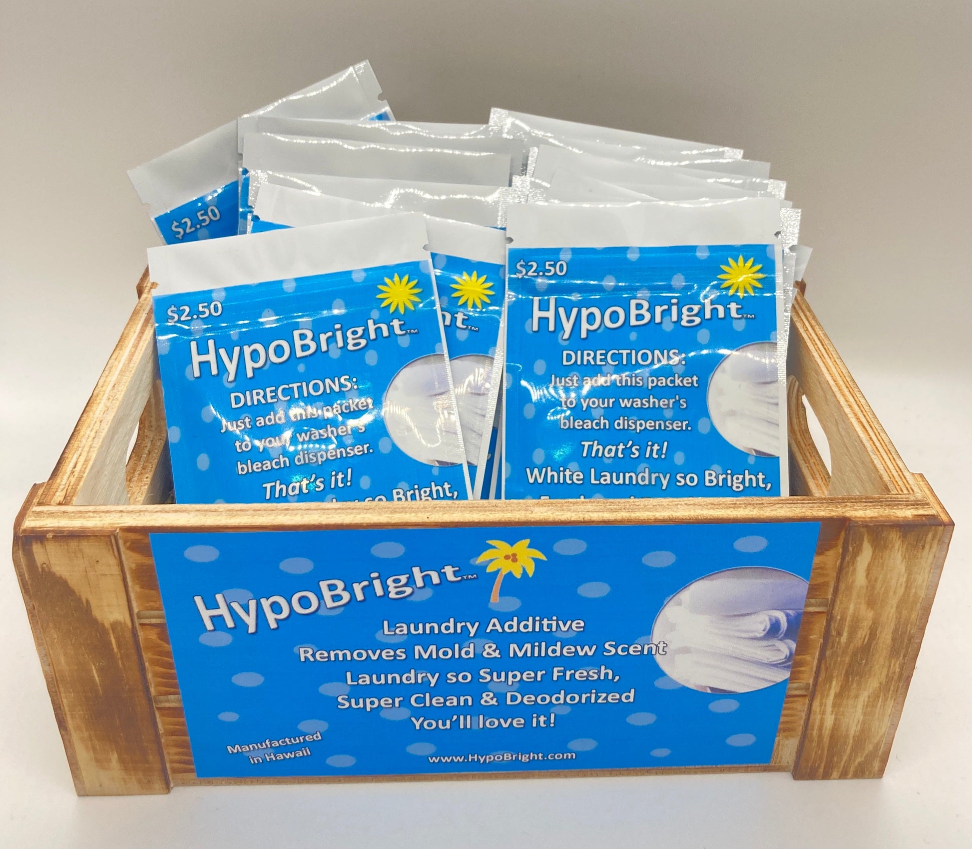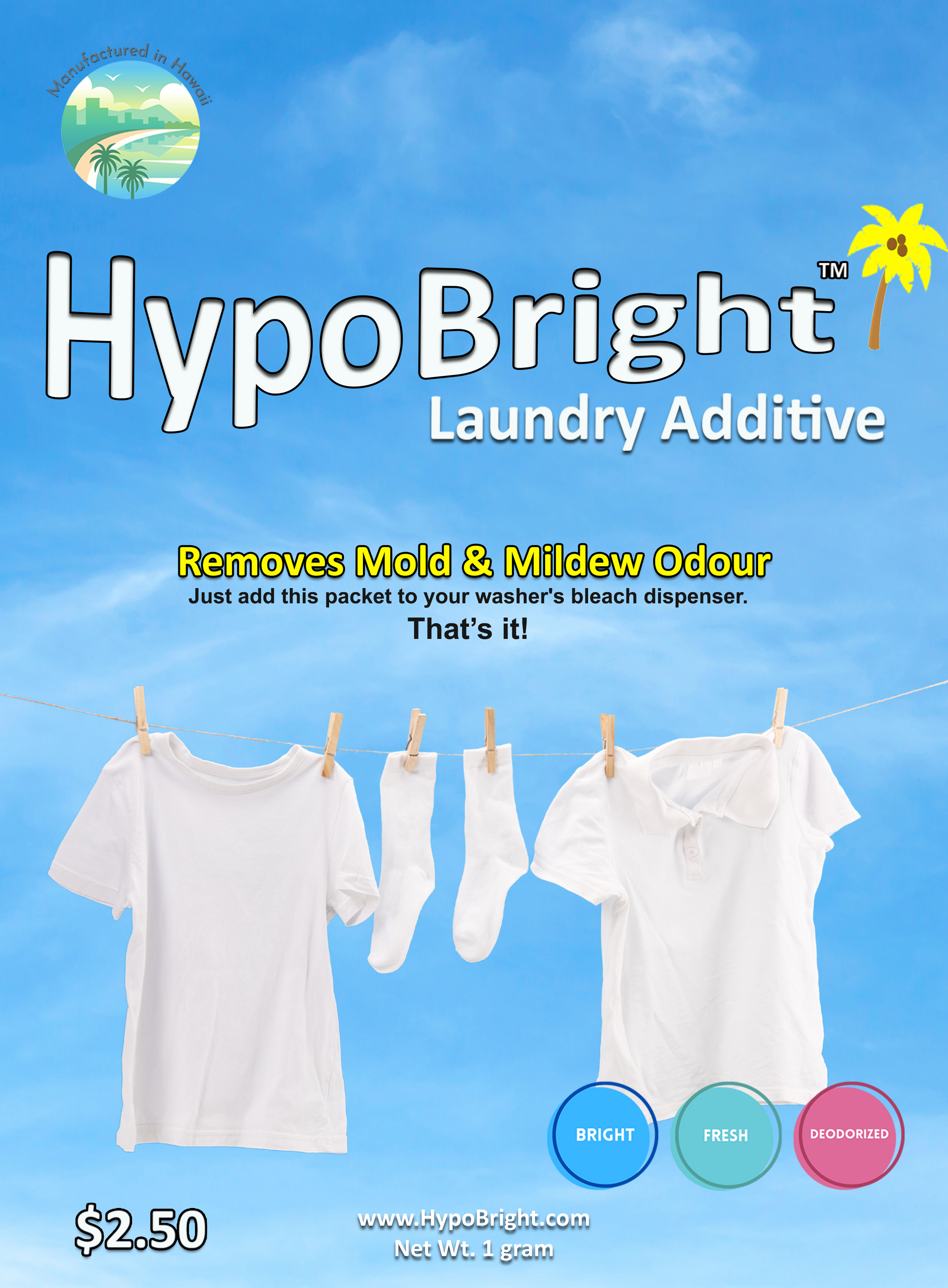 On Hawaiian Island, we live in a tropical place and it's hard to get that clean mold & mildew stains to smell out of your laundry - t-shirts, shorts, towels, and sheets. Some people try vinegar but then you smell like vinegar and mildew. And it's too expensive to through good clothes away. HypoBright to the rescue. It'll make your clothes, sheets, and towels smell new again.
