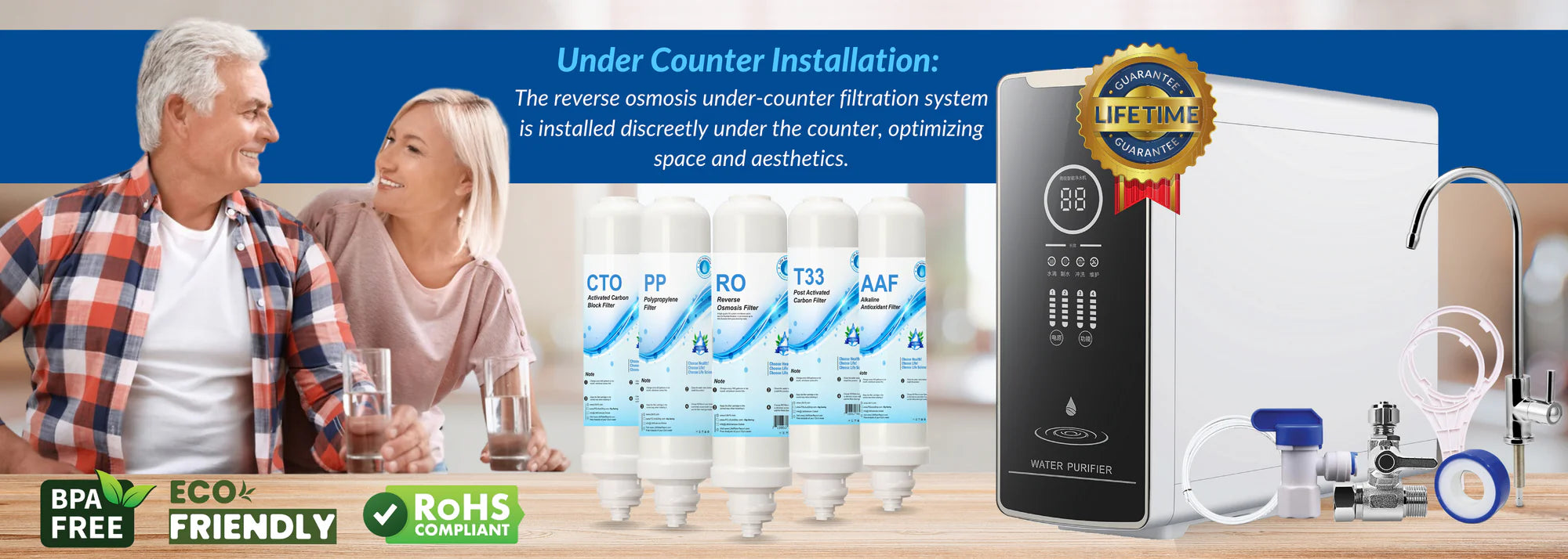 - Under-Counter Installation: The reverse osmosis under-counter filtration system is installed discreetly under the counter, optimizing space and aesthetics.
