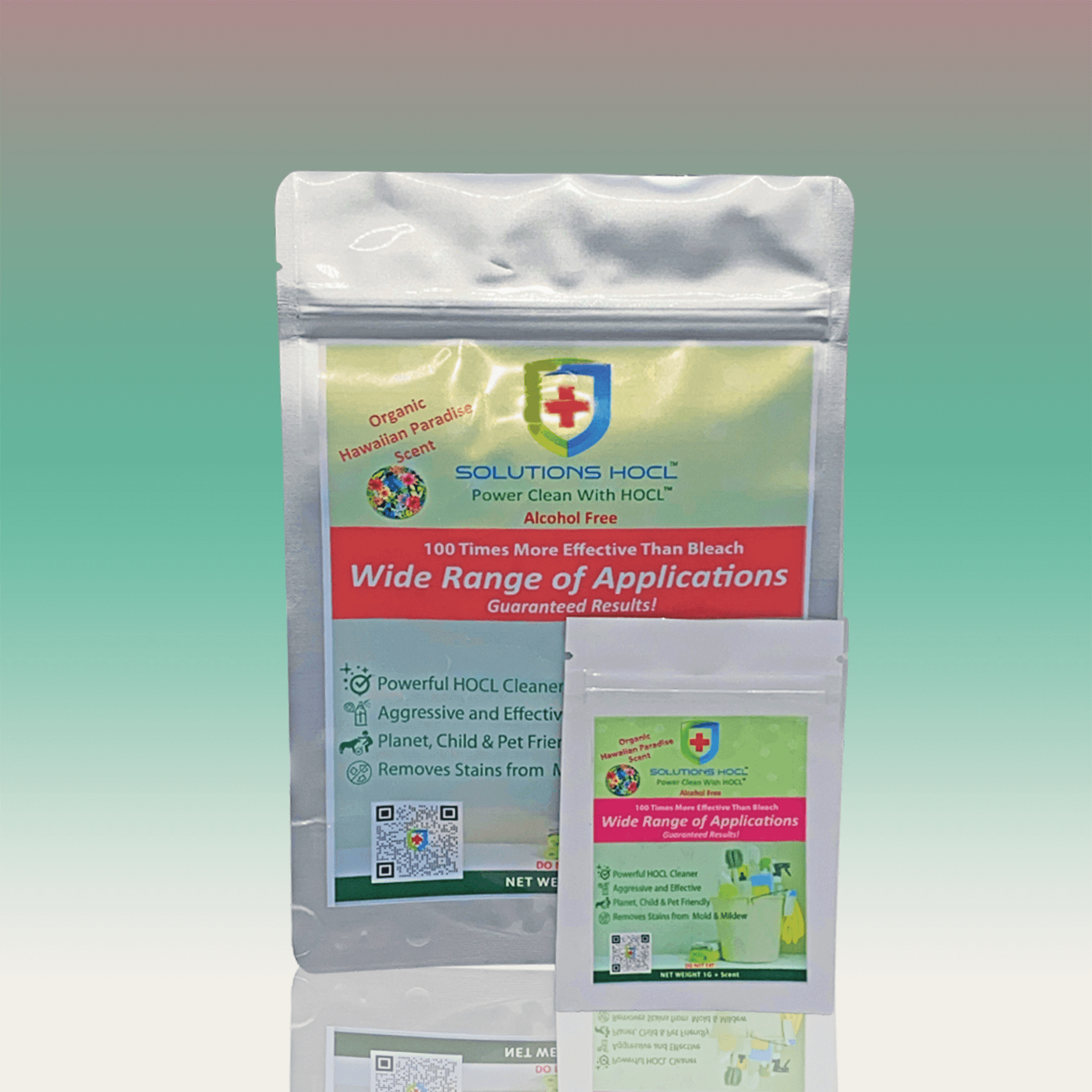 The two (2) individually packed, pre-measured 1-gram packets are easy to use and can yield up to 1 gallon of 150 PPM of Solutions HOCL PowerWash- Power Clean with HOCL. Concentrations can be easily made stronger or more diluted as desired provided by the ppm chart located on each packet or find it on our website.